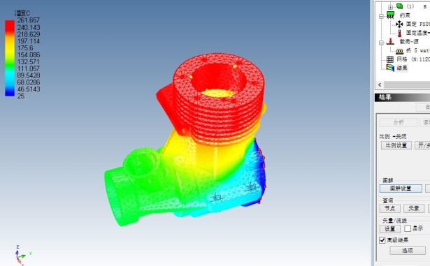 散熱片設計。圖中紅色為通電後正常工作的晶片,工作中產熱,因此顯示為紅色,溫度最高。與晶片相連結構為散熱片,熱根據圖中的流線導走,深藍色溫度最低。